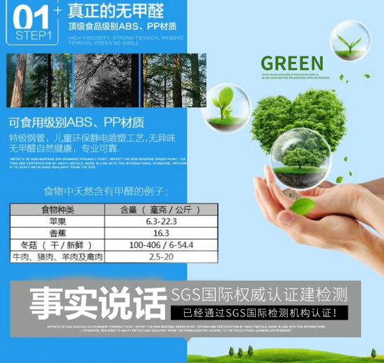 1、真正的無甲醛 可食用級別ABS PP材質(zhì) 優(yōu)質(zhì)鋼管,兒童環(huán)保靜電噴塑工藝,無異味無甲醛自然健康,專業(yè)可靠