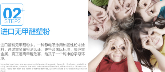 2、進(jìn)口塑粉無甲醛粉末,一種靜電噴涂用熱固性粉末涂料,通過重金屬檢測認(rèn)證,更符合國標(biāo)標(biāo)準(zhǔn),決絕重金屬,真正遠(yuǎn)離甲醛危害,給孩子一個純凈的學(xué)習(xí)環(huán)境。